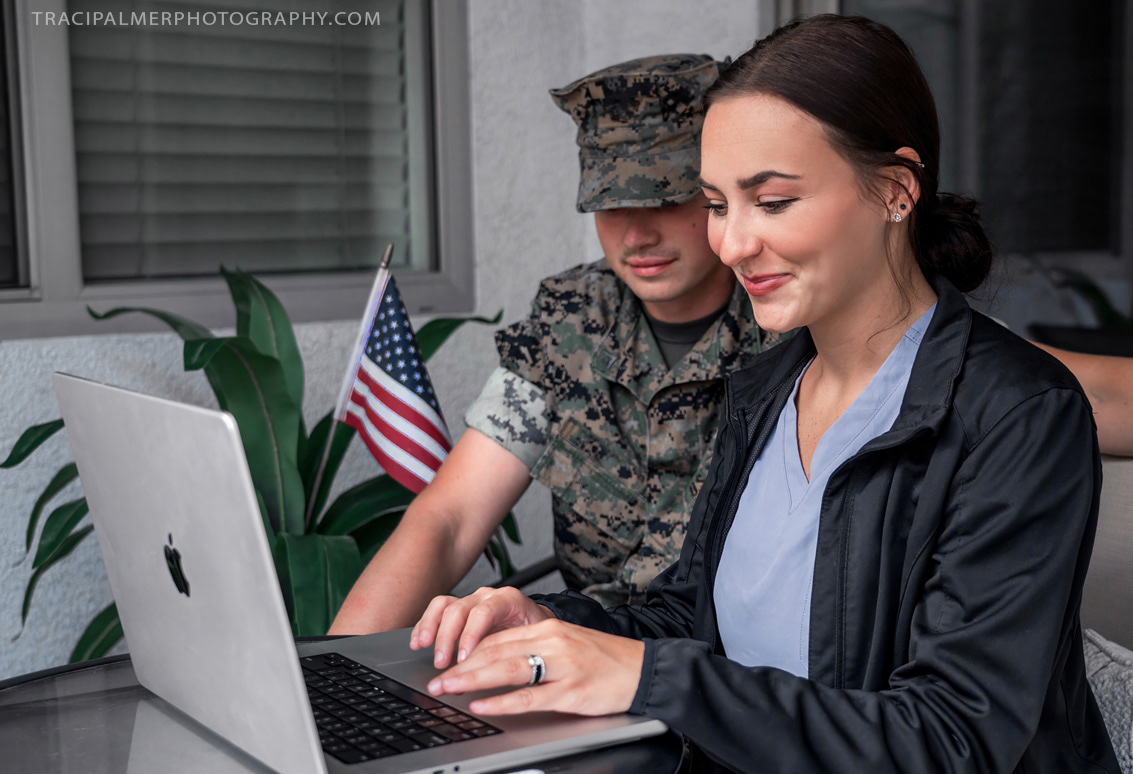 NEED: I need a photo for my book cover. It needs to have a young military couple at home, showing a professional looking spouse looking for a job on the computer. Include her husband in his military uniform and an American flag. She needs to look happy and inviting, he needs to be less predominate in the background. Let's get two options; one wearing an interview outfit and the other wearing a work outfit.
